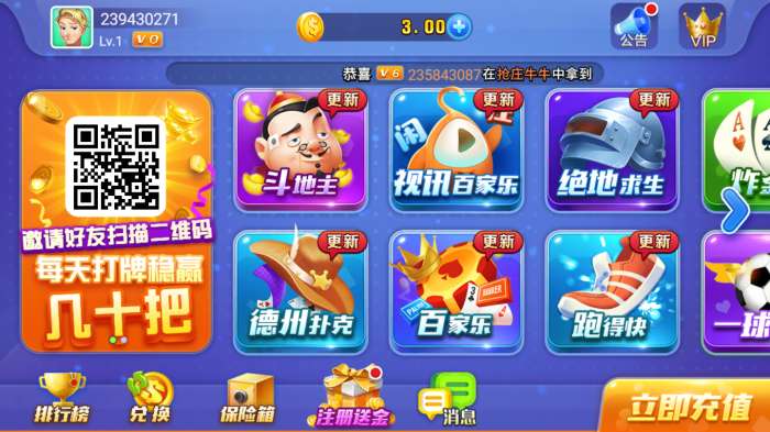 全新上线,玩法丰富,棋牌游戏种类众多,你想玩的在这里都能找到。游戏采用顶尖防作弊系统,保证游戏环境公平公正,玩家输赢全靠技术,放心游戏。还在等什么?快来下载游戏体验吧。