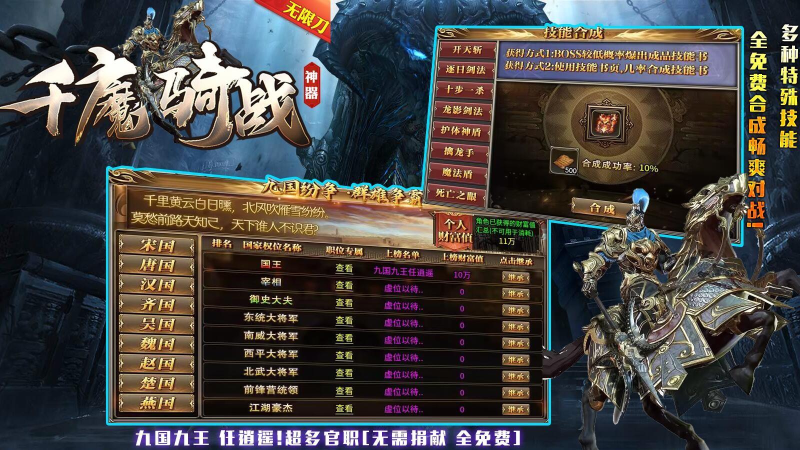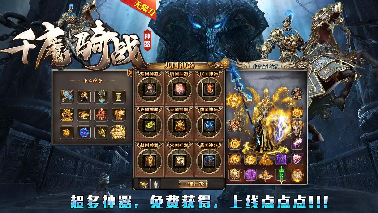 总之,千魔骑战神器传奇手游是一款非常热血刺激的传奇手游,玩家可以在这里体验到丰富的游戏内容和刺激的战斗,不断提升自己的实力和装备水平。如果你喜欢传奇手游类型的游戏,那么这款游戏绝对不容错过!