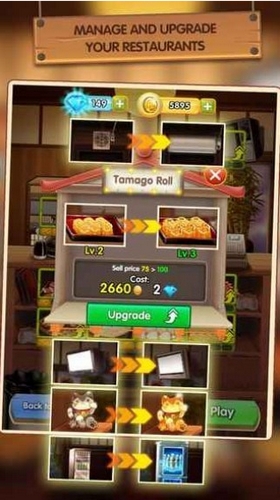 日本餐厅(japan food chain)是一款模拟经营小游戏,玩家在游戏中,拥有一家属于自己的餐厅,你可以通过自己的努力去制作各种美食,不断的满足不同的顾客需要,赚取充足的资金,一步步扩大自己的店面,这很有成就感。