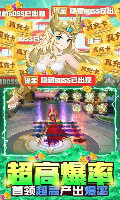 3、BOSS必掉充值卡,无限击杀无限掉落;主线送真充,关关必送充。