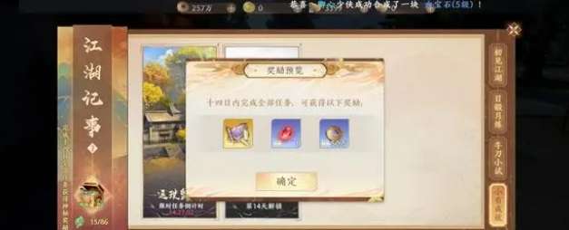 6、【江湖记事】完成特定任务及十四天任务全部完成均有宝石赠送。