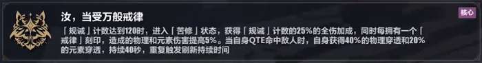 戒律一核心刻印经过调整后,当角色触发QTE时可以获得40%物理穿透和20%元素穿透。而时雨绮罗可以很轻松的触发QTE,相比戒律二只有增幅刻印才有元素穿透,选戒律一解锁核心后就能白嫖20%元素穿透是非常香的。