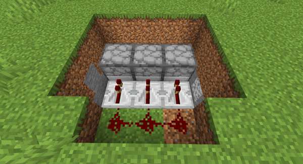 5、然后我们在发射器的后面放三个红石中继器,接着用红石粉与中继器搭建连接。