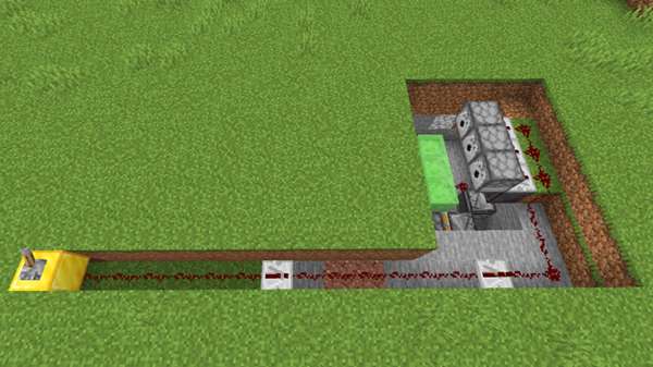 3、接着我们在下图中的位置在放一个粘性活塞和两个侦测器,接着用红石粉将侦测器与‘蹦床’连接起来。