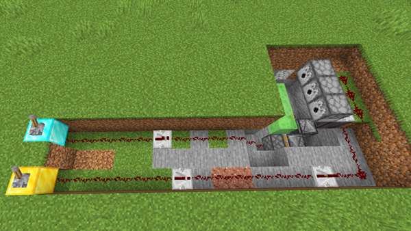 7、接着我们按照刚才的方法再布置以此红石线路,把拉杆放到跟刚才空开一格的地方。
