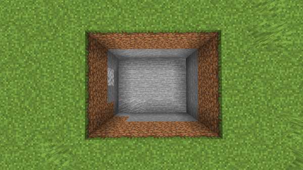 1、首先我们需要找一个比较宽阔的地方,然后挖一个长5格、宽4格、深4格的坑。