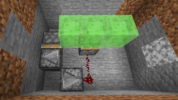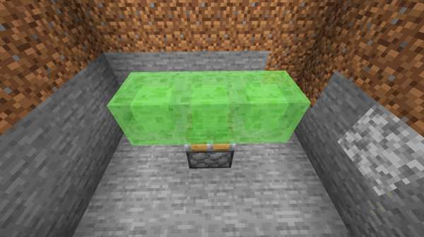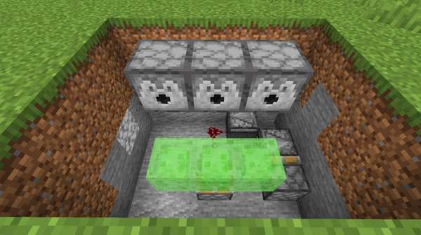 2、接着我们往坑中放一个粘性活塞,接着我们在活塞的上马放三个粘液块。