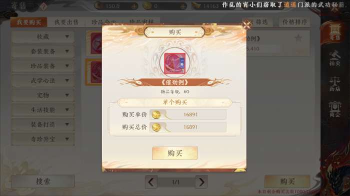 少侠点击【交易】进入交易系统,在【我要购买】分类中选择心仪物品,选中点击【购买】,会提示【购买】界面,确认物品单价、总结、购买数量、购买物品无误后,点击【购买】即可完成购买。