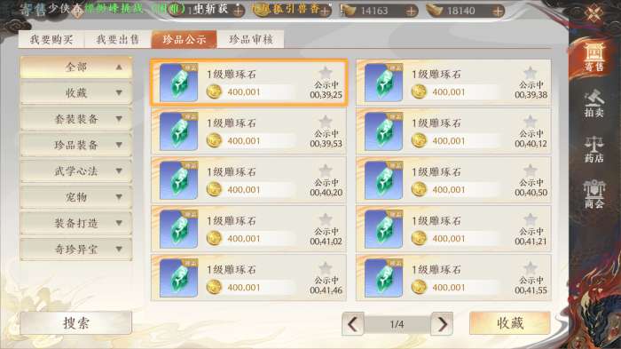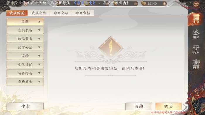 可出售的物品分类包括:套装装备、珍品装备、武学心法、宠物、生活技能、装备打造、奇珍异宝等。