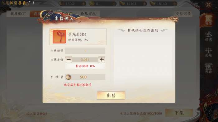 选中要出售的物品,会提示出售数量、出售单价、手续费,和成功出售的税金。