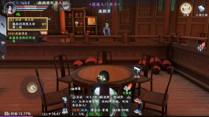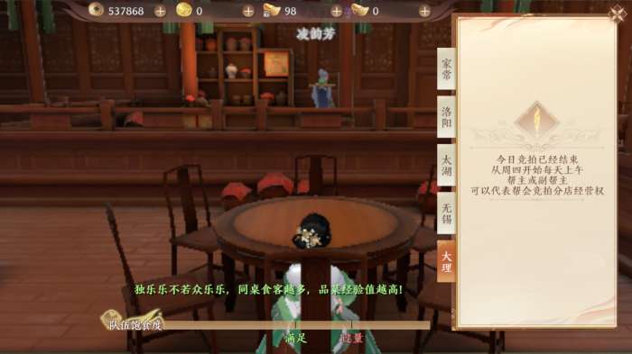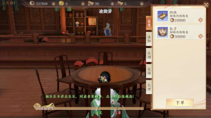 在<醉轩楼>内少侠可以向尚未开始吃饭的其他侠士提出拼桌申请,也可以直接选一个空桌子坐下,等待江湖上的有缘人一起吃饭。