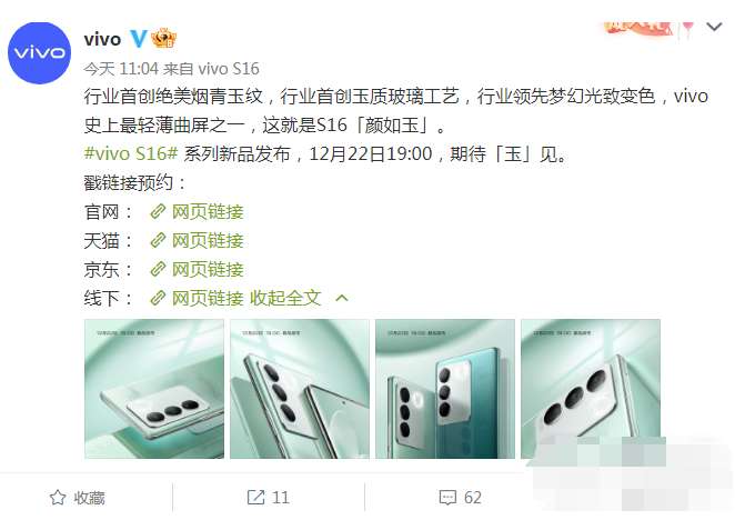 “行业首创绝美烟青玉纹,行业首创玉质玻璃工艺,行业领先梦幻光致变色,vivo史上最轻薄曲屏之一,这就是S16「颜如玉」。”