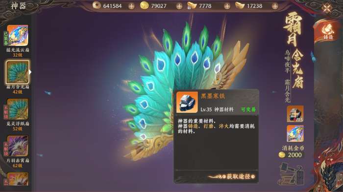 升级提升后,可以通过【铸造】获取更高级神器,需要消耗上一级神器与【黑墨寒铁】。