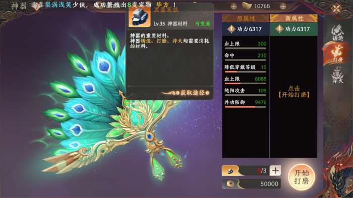 打磨可将随机一条附加属性改变为一条随机生成的新属性,可根据功力的提示选择是否保留新属性。