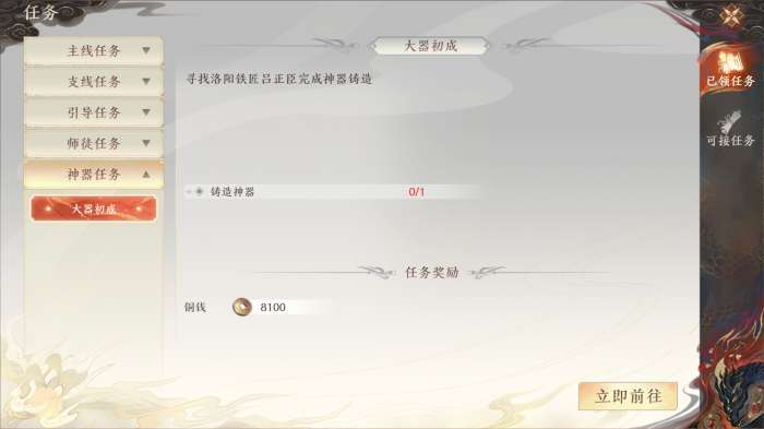 少侠需要完成【神器任务】了解神器过往,解锁全部【神器】功能。