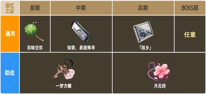 ①通用证:开局带百味空欢,解锁空梦一核心后换知音,易逝难寻,后期再换成「纪念」;最后boss层任意带即可。