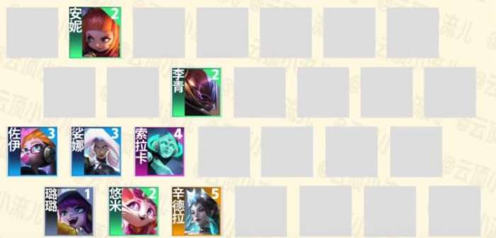 2、阵容构成:安妮+盲僧+佐伊+琴女+奶妈+猫咪+璐璐+辛德拉;羁绊效果为6爱心使者3小天才2淘气包;