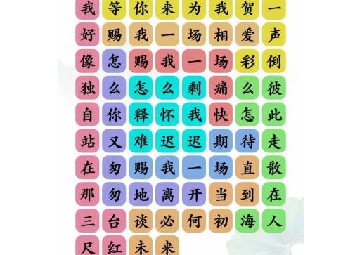 进入游戏后,您会看到横着的一些不通顺的句子,如“我等你来为我贺一”、“好赐我一场相爱声”和“像怎赐我一场彩倒”等。同时,竖着看还有一些不通顺的句子,如“我好像独自站在那三尺”、“等赐怎么你又匆匆台红”和“你我赐怎释难赐地谈未”。这些句子都与歌词有关,您可以通过这些句子来回忆起一些歌词。