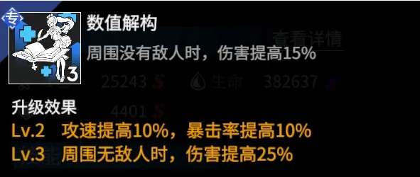 星野结月拥有火力职业专属的被动,在周围没有敌人时提高自身伤害,并且额外提高攻速和暴击率,使她在后方利用被动和元素效果对敌方造成大范围高额伤害。