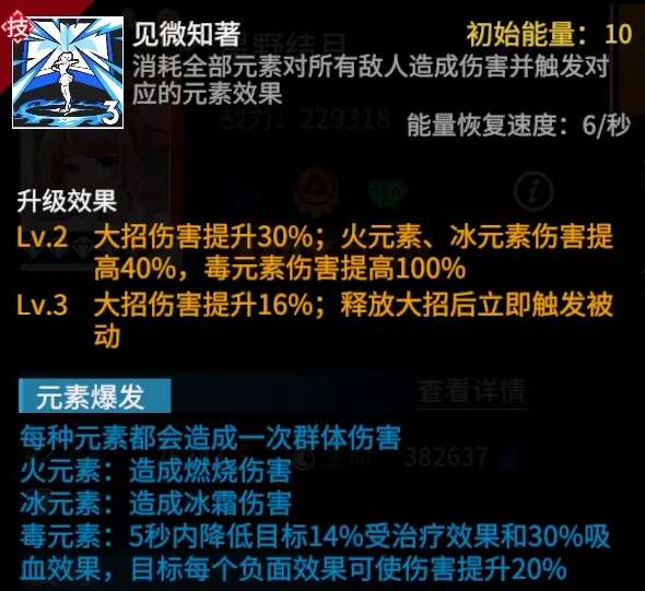 星野结月的大招同样会受到元素效果的影响,释放大招时会清空所有元素攻击敌方全体,大招每消耗一种元素就会额外触发一次群体伤害,伤害类型和触发效果根据被消耗的元素决定,配合附加多种负面状态的手办让敌人在狂风暴雨般的轰炸中灰飞烟灭!