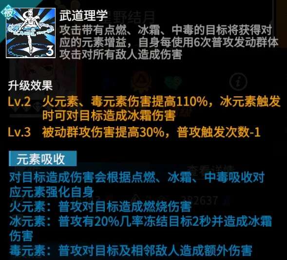 星野结月攻击带有点燃、冰霜、中毒状态的目标会获得对应的元素增益,每种元素都会强化她的普攻和大招。