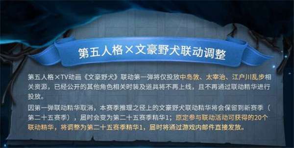 对于此次联动的调整,我们向所有侦探致以最诚挚的歉意,未能给大家提供之前约定的联动体验,再次向文豪野犬以及喜欢文豪野犬及第五人格的粉丝们诚挚道歉!