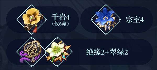 【千岩4】:仅适合6命珐露珊,加攻覆盖率比宗室还高。触发也很稳定。