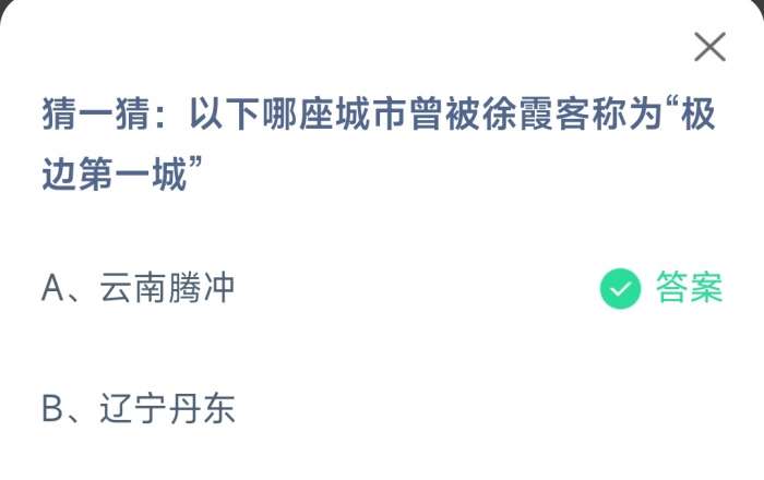 2023支付宝蚂蚁庄园5月19日的题目已经更新了,今天的题目为:以下哪座城市曾被徐霞客称为极边第一城?云南腾冲还是辽宁丹东?正确答案是什么,可能很多小伙伴可能还不太清楚。下面小编就为大家带来了正确答案分享,希望能帮助到你。