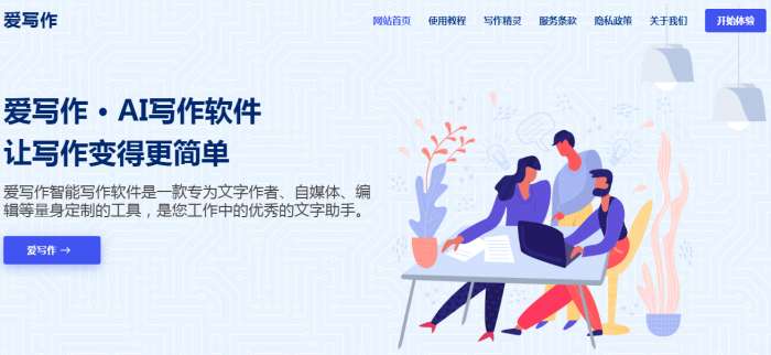 1、打开爱写作官网(http://www.aixiezuo.com.cn),点击开始体验,注册并登录账号。