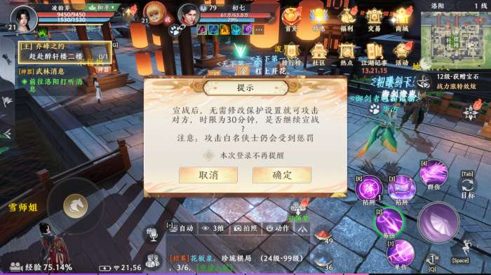 PK玩法会在28级开启,侠士可以调整自己的状态是否和平,同时部分地图是不可以宣战的哦。
