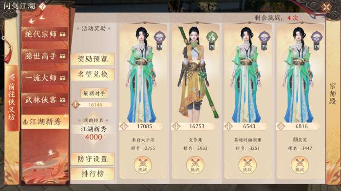 在活动-江湖宗师殿,少侠可以挑战同江湖榜的其他侠士。