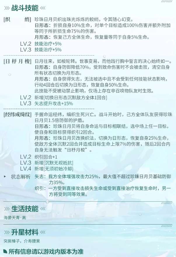 每次月形态的时长有且仅有四个回合,而在这四个回合内,珍珠日月贝相当于变成了一套外置膳具,膳具效果为:全体加攻,且每次普攻为全体队友回血。