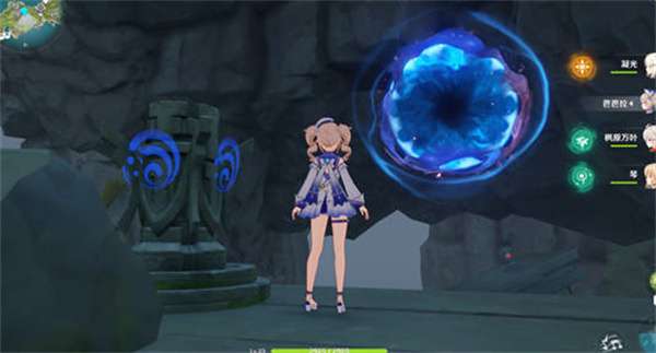 1:首先我们需要到达此位置,然后就会看到一个山洞,进入山洞之后,找到如图位置进行互动,有四个元素方碑,按照顺序进行触发,距离不是很远,比较容易找到;