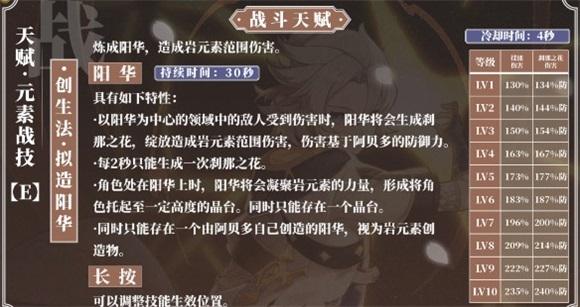 当敌人受到伤害时,阳华领域会瞬间生成刹那之花,绽放造成岩元素范围伤害,伤害基于阿贝多的防御力。值得注意的是,每2秒只能生成一次刹那之花,因此玩家需要掌握好时机,充分利用这一机制。