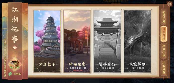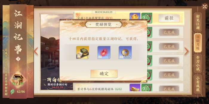 初入江湖的少侠,完成限时十四日全部任务可以获得奖励。
