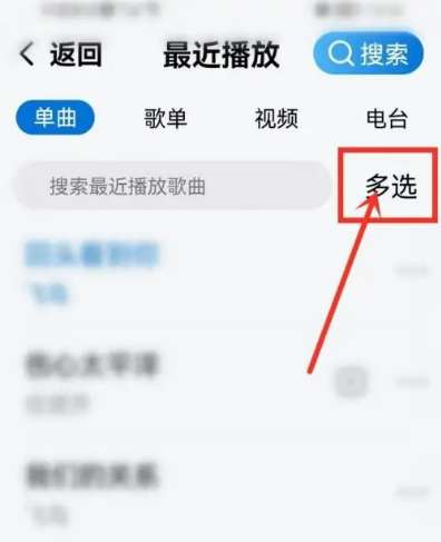 2、进入最新播放后,可以看到我最新1000首歌曲的记录,点击右上角【多选】;