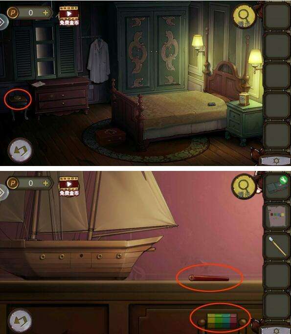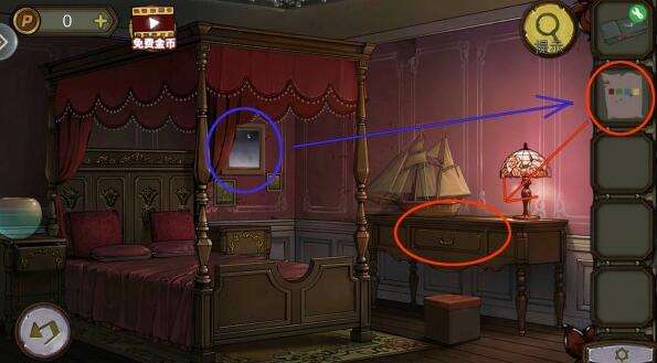 2、我们根据墙画英文以及纸条颜色,打开柜子获得圆片,在桌上拿铅笔。用圆片打开右卧盒子,获得半块宝石。柜子解谜思路是:墙画英文填纸条4个色块上,再对应密码锁上颜色。