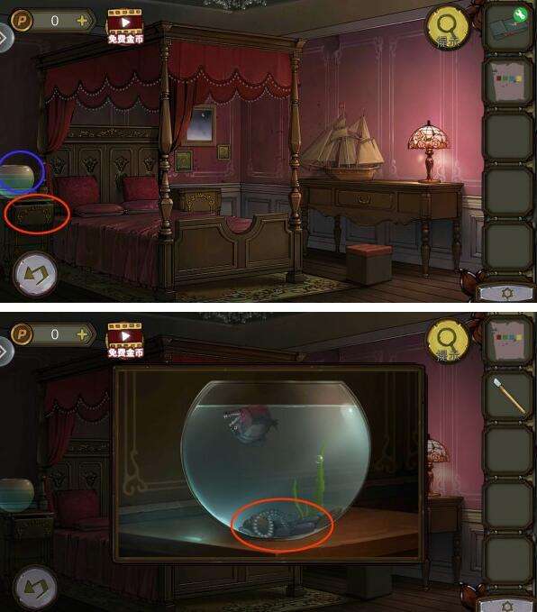 3、接着是柜子密码:LEAD。我们在床头柜中拿电击器头,用电击器手柄和电击器头部组成电击器。电击器电晕食人鱼,即可获得鱼缸中的项链,用玻璃刀拿项链上的半块宝石。