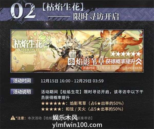 活动期间[枯焰生花]限时寻访开启,该寻访中以下干员获得概率提升