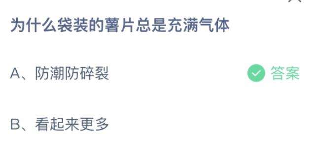 为什么袋装的薯片总是充满气体?这是支付宝蚂蚁庄园小课堂2023年2月10日问题之一,答对后能领取小鸡饲料180克,答错只有30克饲料,今天的正确答案是:防潮防碎裂。下面小编就给大家带来了支付宝答题2月10日答案2023蚂蚁庄园分享,大家可以根据答案去选择正确选项哦。