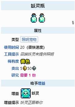 妖灵瓶是个困难模式、世纪之花后的照明宠物物品,用于召唤跟随玩家的发光妖灵。激活时,它类似于闪烁灯芯。除了可疑触手和光之珠宝具有相同的光照半径外,妖灵比其他照明宠物更亮且能和更好地与玩家维持同步。它会按照玩家按下的方向键移动。妖灵的移动范围大致上是玩家碰撞框向下、向左、向右 7 格以及妖灵的正常起始位置向上 7 格。