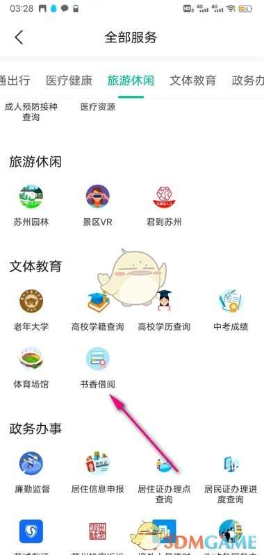 2、在全部服务界面,点开文体教育,点击书香借阅。