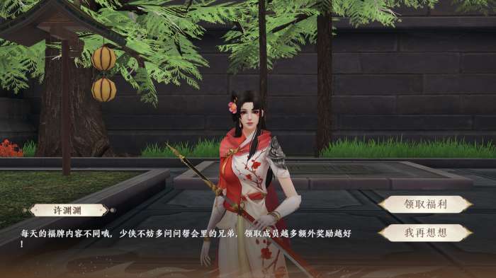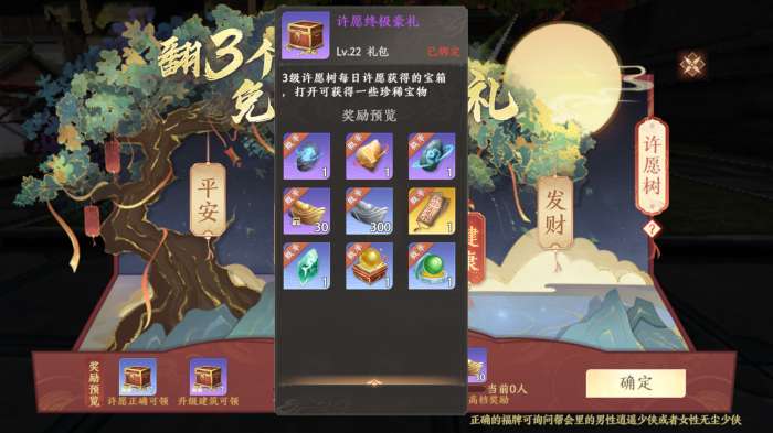 许愿树宝箱领取时,需要翻出正确的“福牌”,每天帮会里随机两种门派的少侠或女侠知晓正确的福牌,少侠可在帮会频道发起询问。获得好心人的告知帮助后不要忘记道谢哟!