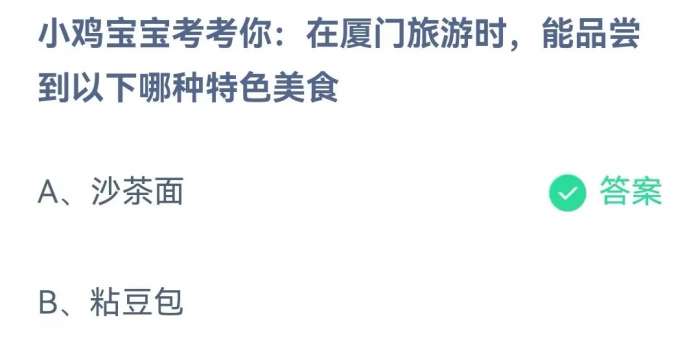 2023支付宝蚂蚁庄园5月20日的题目已经更新了,今天的题目为:小鸡宝宝考考你在厦门旅游时能品尝到以下哪种特色美食?沙茶面还是粘豆包?正确答案是什么,可能很多小伙伴可能还不太清楚。下面小编就为大家带来了正确答案分享,希望能帮助到你。