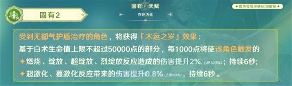 白术的固定天赋机制在地为化,是一个非常强大的治疗机制。这个天赋能让被无郤气护盾治疗的角色获得“木运之岁”效果,根据白术的生命值上限不超过50000点,每1000点就能让这个角色触发的燃烧、绽放、超绽放、烈绽放反应造成的伤害提升2%,超激化、蔓激化反应带来的伤害提升0.8%,这个效果可以持续6秒。下面我们一起来详细了解一下这个机制的机制特点。