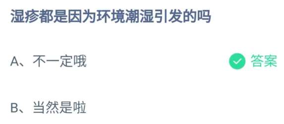 2023支付宝蚂蚁庄园5月25日的题目已经更新了,今天的题目为:湿疹都是因为环境潮湿引发的吗?不一定哦还是当然是啦?正确答案是什么,可能很多小伙伴可能还不太清楚。下面小编就为大家带来了正确答案分享,希望能帮助到你。