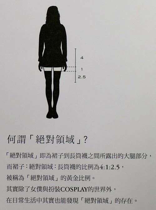 绝对领域,是一种日本主流社会使用的御宅族ACGN次文化用语,指的是穿着短裙搭配过膝袜的时候,裙底和过膝袜之间若隐若现的大腿肌肤。简单说就是指的是女生穿迷你短裙和过膝袜时裸露出来的那一部分大腿。