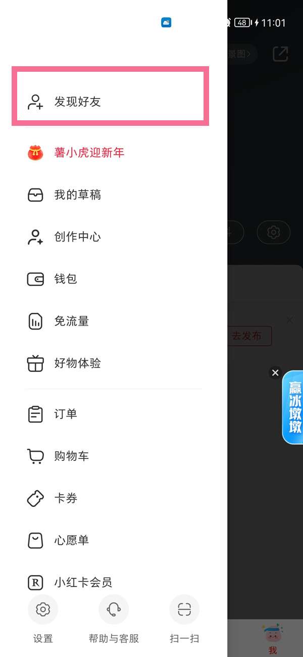 1、打开手机小红书app,在“我”页面点击右上角三横。