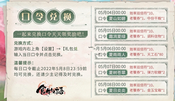 食物语立夏福利口令是为了迎接夏天特意发放的奖励,所有玩家均可免费领取兑换,在游戏内获得效率双倍符、老餮券、中份干粮等等资源,下面就一起来看下2022立夏福利口令码分享吧。