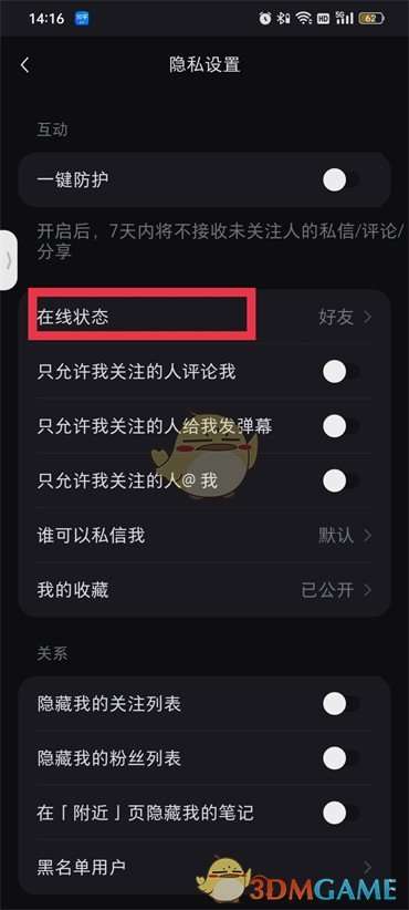 3、进入到隐私设置的页面之后就可以看见【在线状态】了,然后开启在线状态即可。